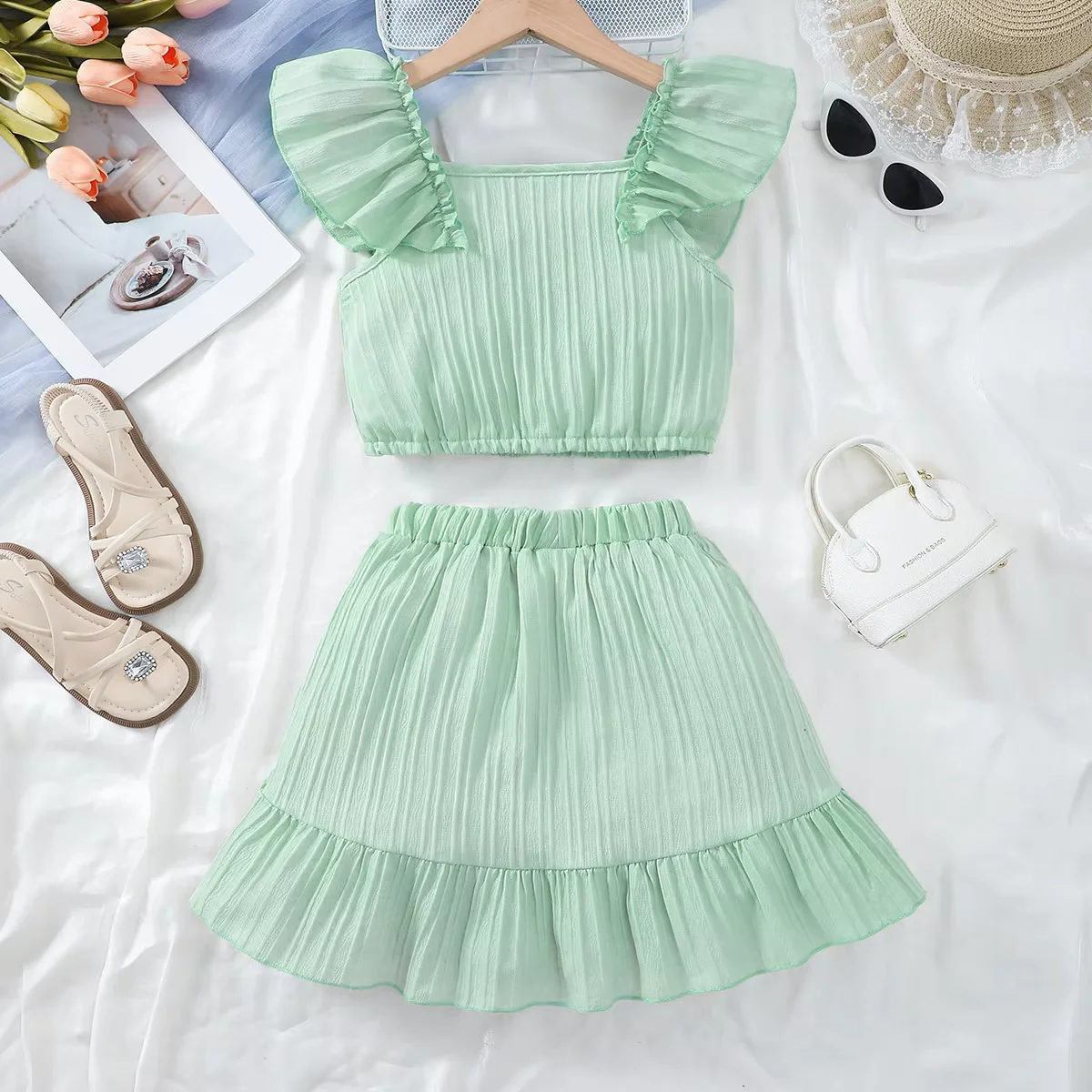 Kid Girls Summer Princess Clothing Set Flutter Sleeve Plain Color Tops+Short Skirt Sweet Style Party Wear For Child 8-12 Years
