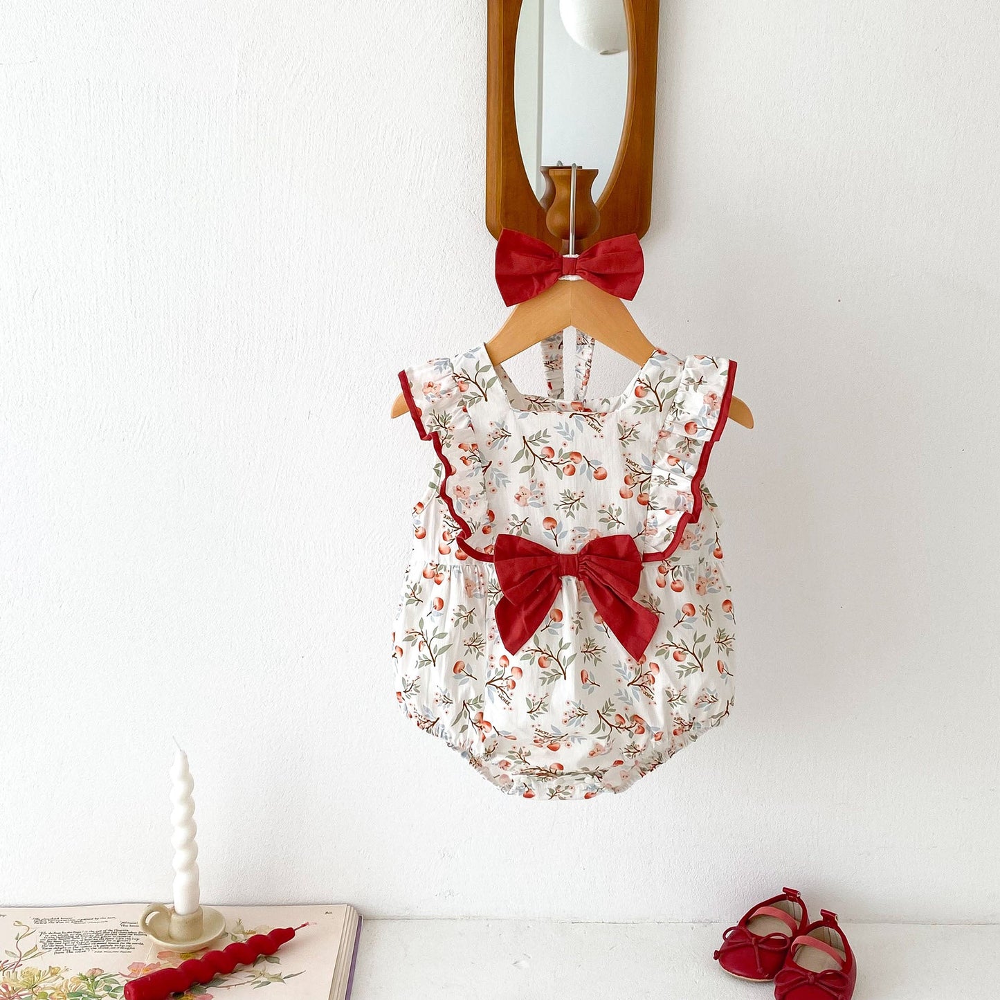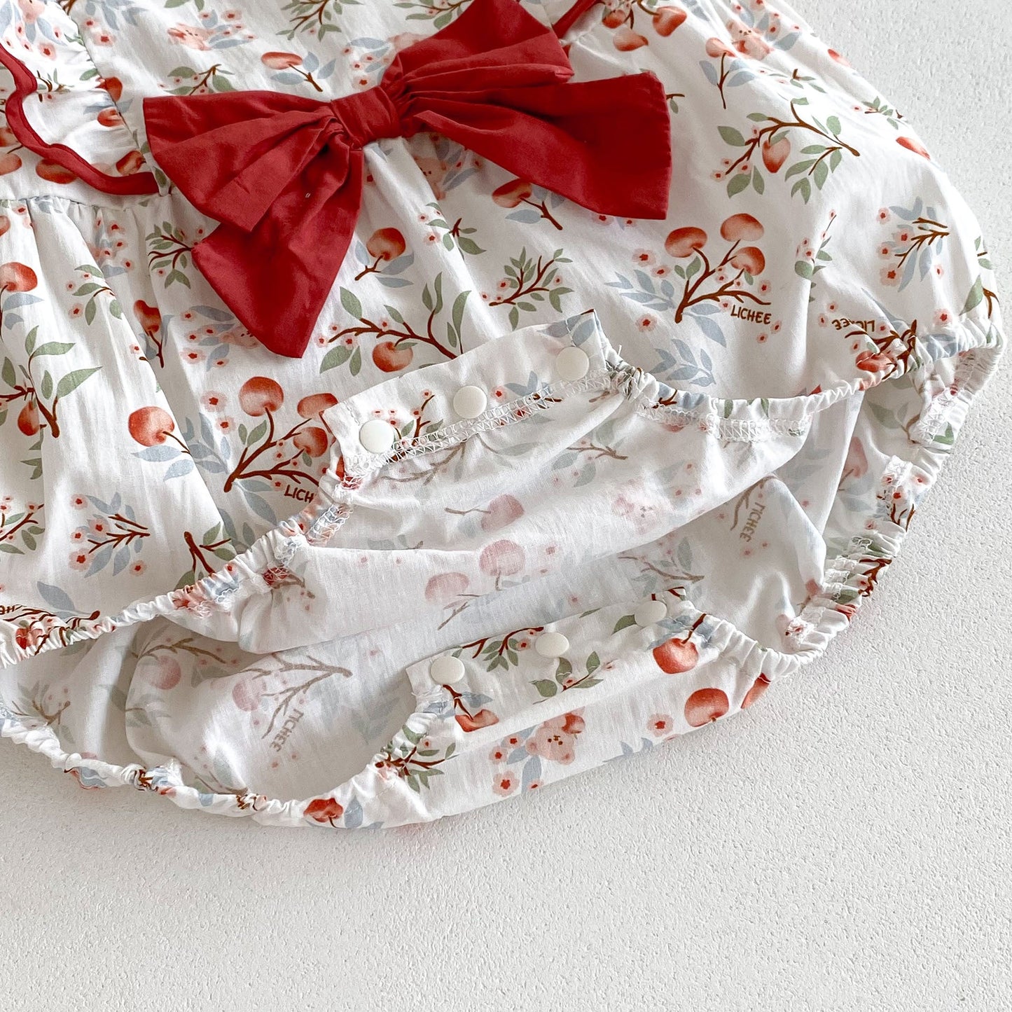 New Design Summer Baby Kids Girls Cherry Pattern Square Neck Sleeveless Big Bow Onesies